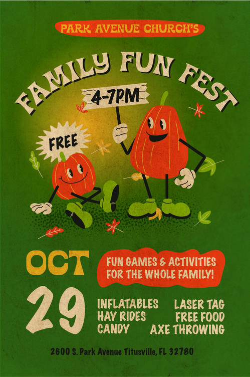 Join Park Avenue Church and the North Brevard community at our annual Family Fun Fest on Sunday, October 29th from 4pm-7pm. This free fall festival will be filled with activities for all members of the family!