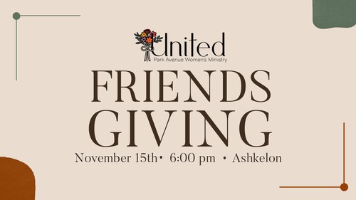 Join the United Women’s Ministry for Friendsgiving on Saturday, November 15th, from 6:00–8:00 PM at Ashkelon! All women (teenagers and up) are invited to enjoy an evening of gratitude, friendship, and fellowship in Christ. Share a meal, connect with others, and celebrate God’s goodness together.